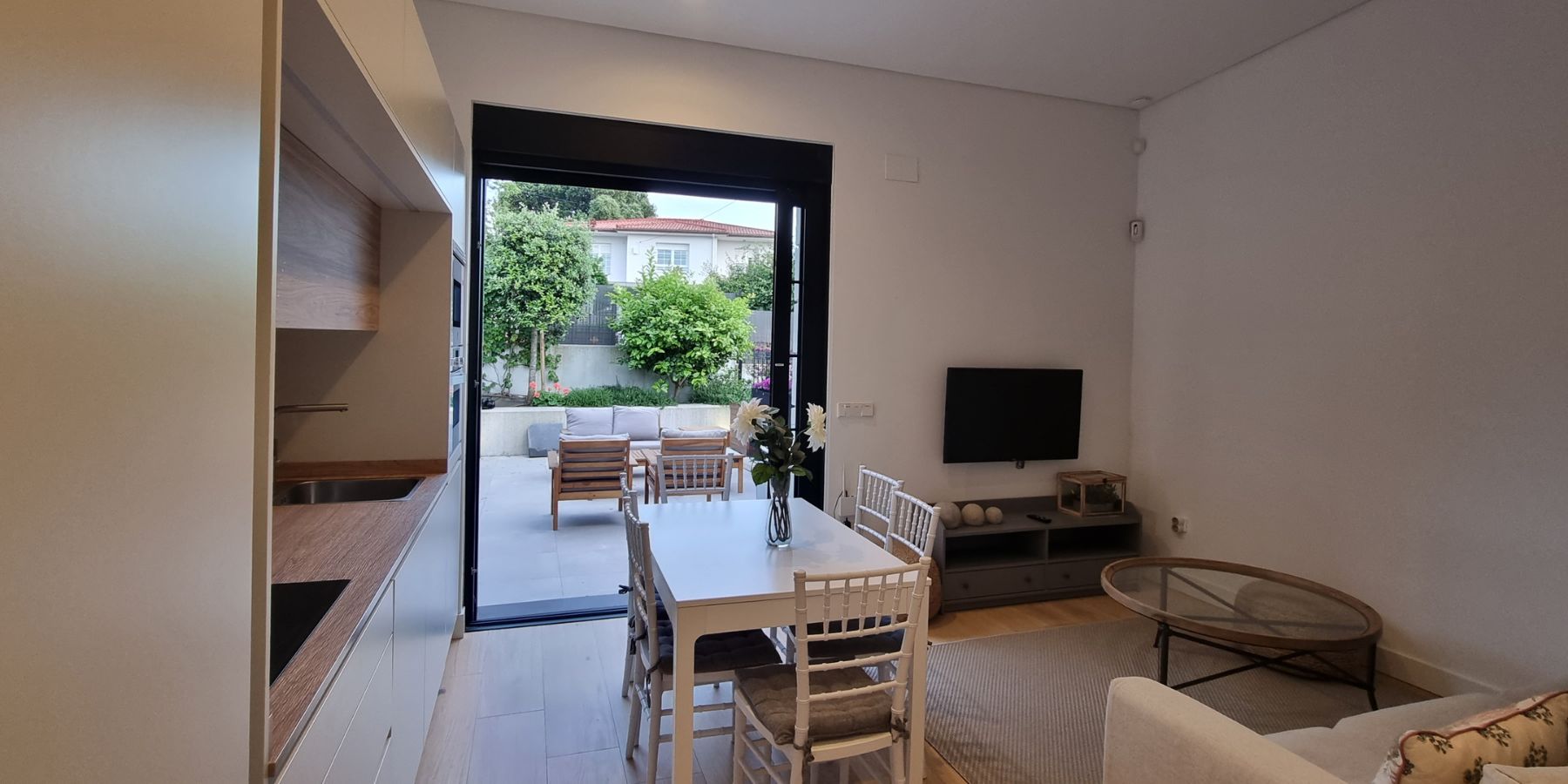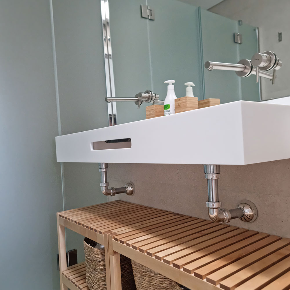 La planta baja se compone de un amplio salón/comedor/cocina con un gran ventanal que da acceso al jardín-terraza propio de cada vivienda dotada de confortable mobiliario de Teka. El dormitorio principal cuenta con una cama de 180×200 separables en dos camas de 90. El baño consta de ducha de fácil acceso con rociador en el techo. Cocina totalmente equipada y electrodomésticos integrados.